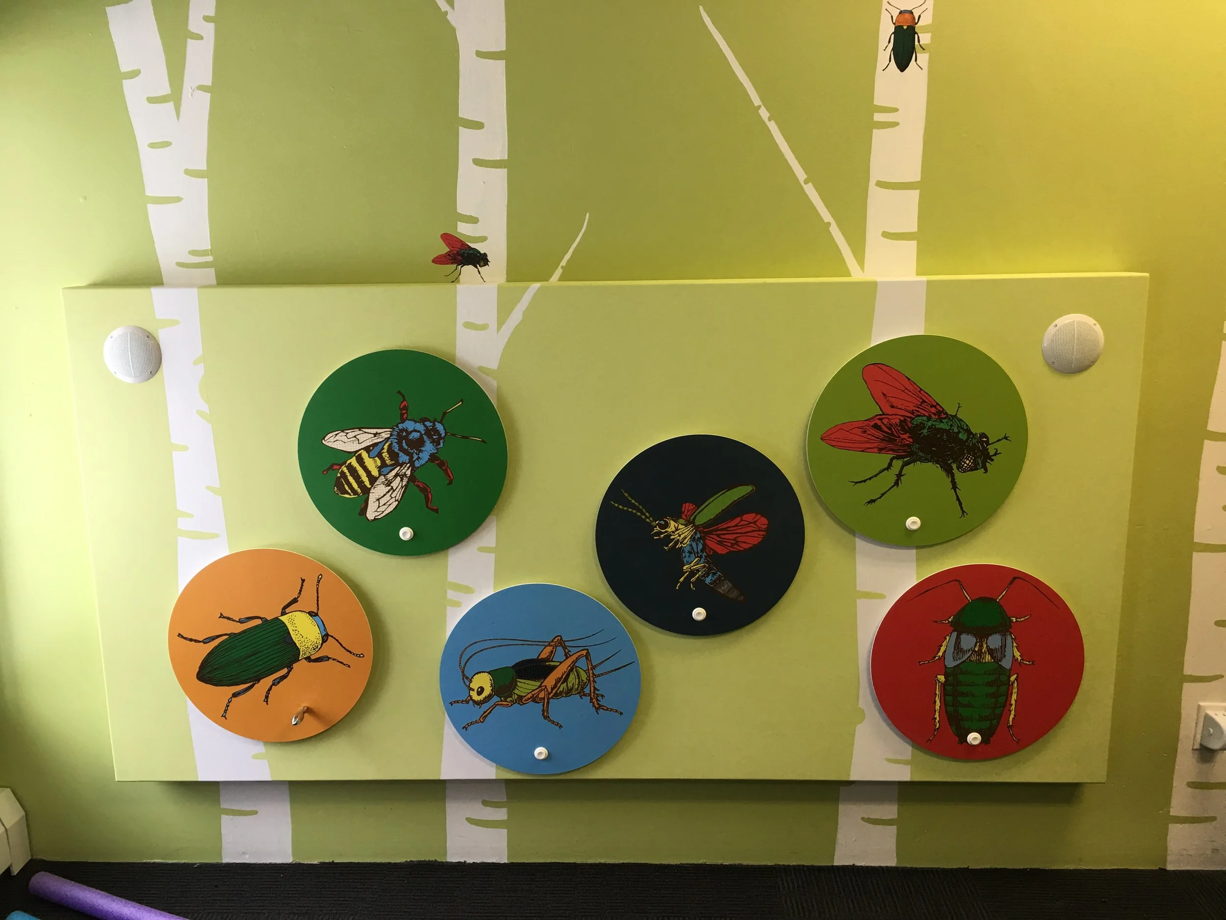 It’s a Bug’s World is all about bugs. Kids can see live bugs, dress up as a bug and play in a large grass "forest", and race little mechanical hex bugs through a maze. What they wanted from me was an interactive wall with 5-6 different bug signs on it that would play the sound they make when touched and potentially light up. They wanted one of the signs to be a click beetle that was motorized to spin when touched. The exhibit will be up for at least a year, so it needed to be able to withstand the abuse of kids.