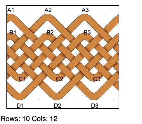 Scroll down until you see the knot grid and use the mouse to click and drag the bottom right corner until the grid is 10 rows x 12 columns. You may also notice a little further down it says that the knot takes 1 strand to tie and has 30 facets and 30 crossings. You can drag the grid to other dimensions as well, but you'll want to make sure the left and right side of the grid match up to form a complete knot.